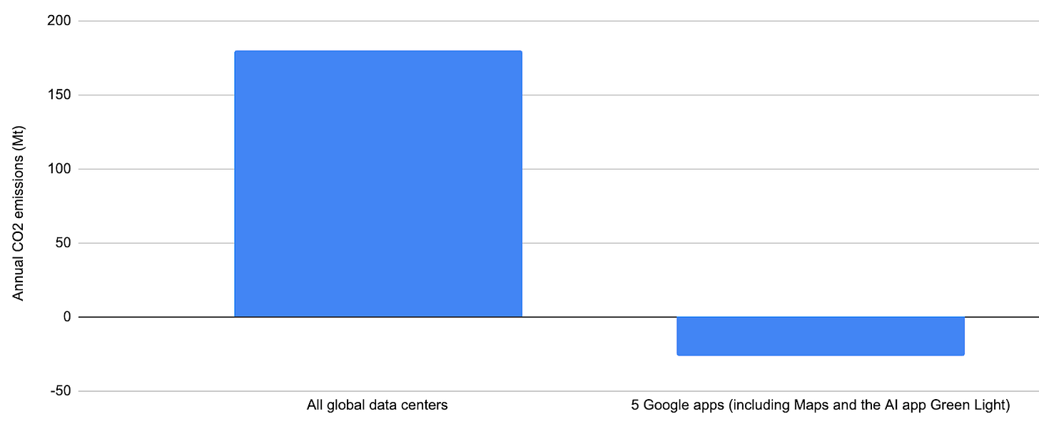 Another example is Google Maps. Maps uses hardly any energy in data centers and has optimized billions of car trips to be as physically short as possible. It seems certain that the emissions Maps has saved completely dwarf the emissions it’s caused by using energy in data centers. Google reported that just five of its apps (including maps) prevented ~26 million tonnes CO2e in 2024. That alone is 14% of all current data center emissions.