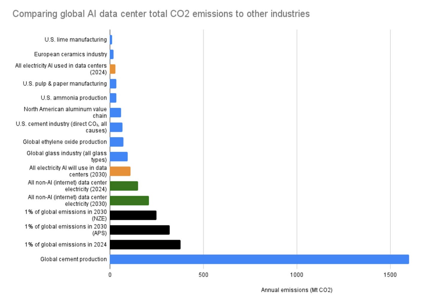 Obviously this is not nothing, but take a minute to look through everything else in the infographic. If you hadn’t heard of data centers before, and saw them listed as a tiny stripe (they would be a small sliver of the “commercial” stripe), would something emitting 0.48% of global emissions stand out to you as something that required special attention? How many conversations in the last year have you seen about the emissions of cement, or landfills, or paper & pulp production?